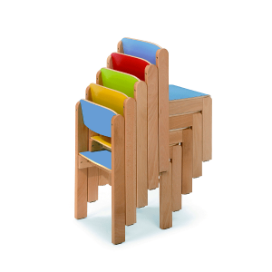 Silla apilable fabricada en madera maciza de haya acabada en barniz no tóxico. Las patas incorporan tacos antideslizamiento. Asiento y respaldo de contrachapado curvado laminado (HPL) de 10 mm. de espesor con cantos redondeados.
