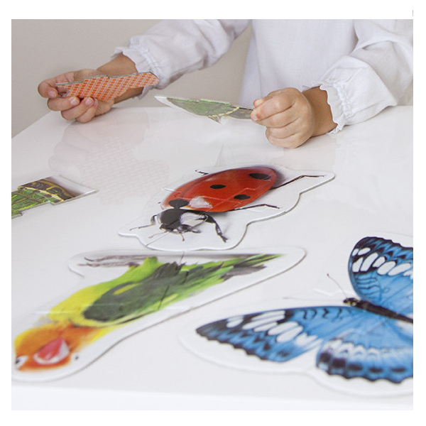 Set de 9 puzles silueteados con animales de gran tamaño, de 3 y 4 piezas, para niños a partir de 2 años. Realizados con piezas grandes en cartón grueso de máxima calidad y resistencia.